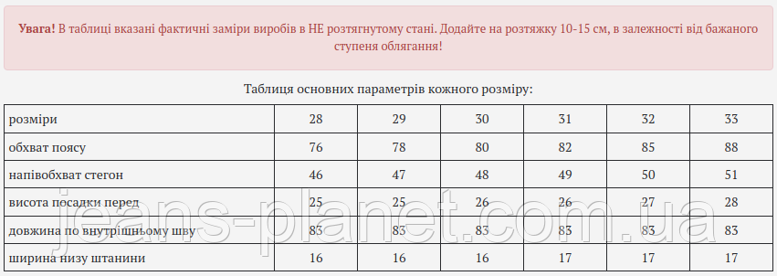 • Для визначення розміру пройдіть будь-ласка в нашу роздягальню. Зробіть відповідні заміри своїх джинсів і порівняйте Ваші дані з таблицею.