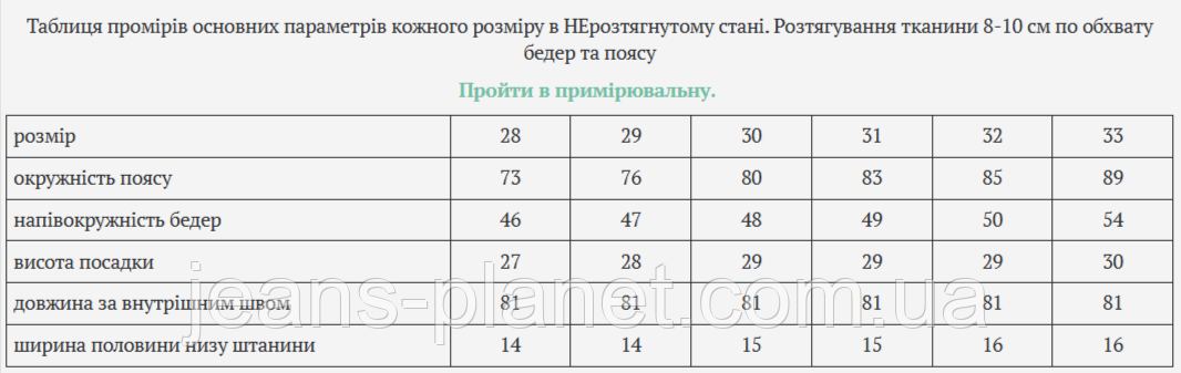 Таблиця промірів основних параметрів кожного розміру в НЕрозтягнутому стані. Розтягування тканини 8-10 см по обхвату бедер та поясу