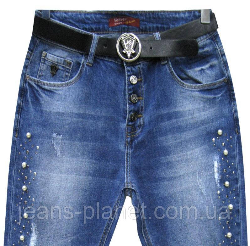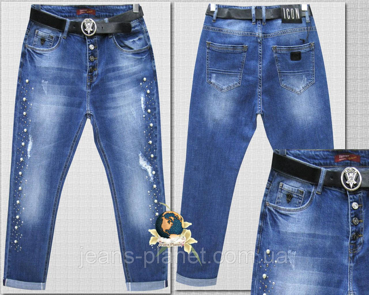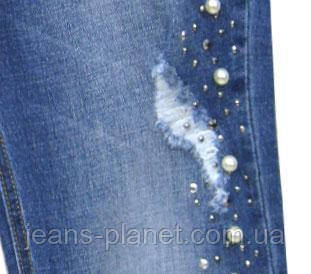 • Ошатні жіночі джинси вільного крою з камінням під перли та стразами вздовж бічних швів виробу.