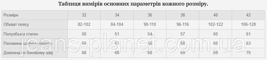 | Розміри | 32 | 34 | 36 | 38 | 40 | 42 |