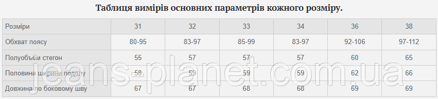 Таблиця вимірів основних параметрів кожного розміру.