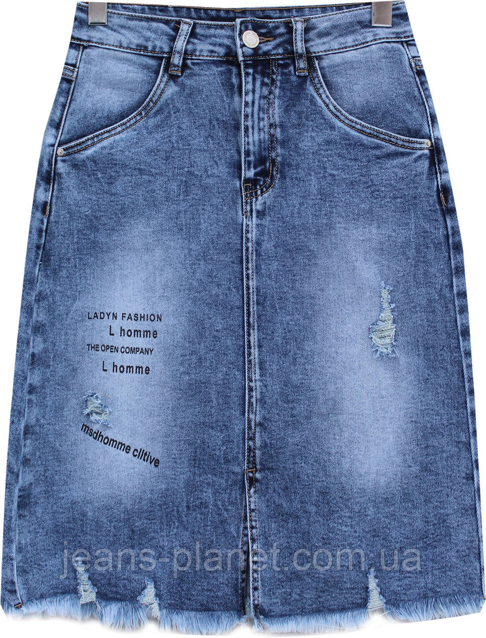 - Модна джинсова спідниця елегантної довжини — середина коліна, з бахромою по низу, з написом- посиланням на бренд виробника на правій поличці виробу.
