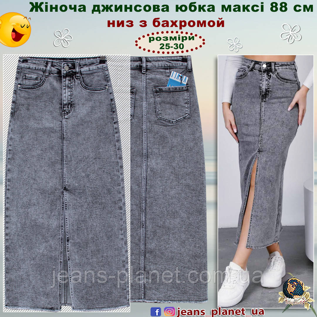 Наймодніша довга джинсова спідниця максі — олівець з розрізом та бахромою