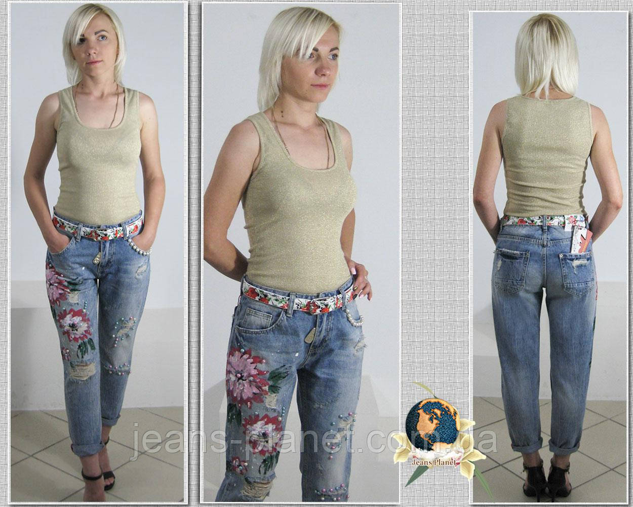 Джинси жіночі літні рвані з камінням під перли та малюнком на тканині.