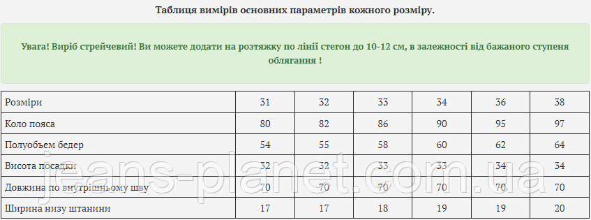 - Більш детальну інформацію про товар і про те, як правильно визначити свій розмір, дивіться на нашому сайті Jeans Planet.