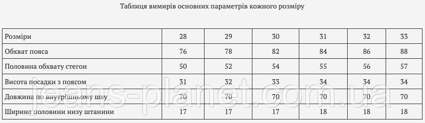 | Ширина половини низу штанини | 17 | 17 | 18 | 18 | 18 |