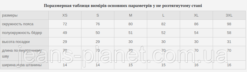 - Подобрать размер! Це джинси вільного крою. Їх можна підбирати як за своїми параметрами, де Ваші талія і бедра відповідає виміру кола пояса і півколо бедер (x 2 ) по таблиці, так і давати на розтяжку тканини 10-15 см, і носити виріб як звичайні джинси в обтяжку.