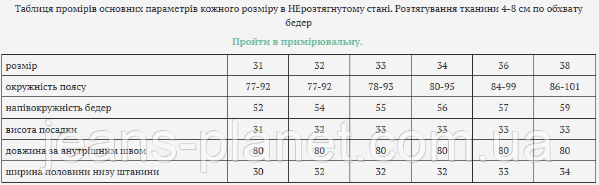 Таблиця промірів основних параметрів кожного розміру в НЕрозтягнутому стані. Розтягування тканини 4-8 см по обхвату бедер
