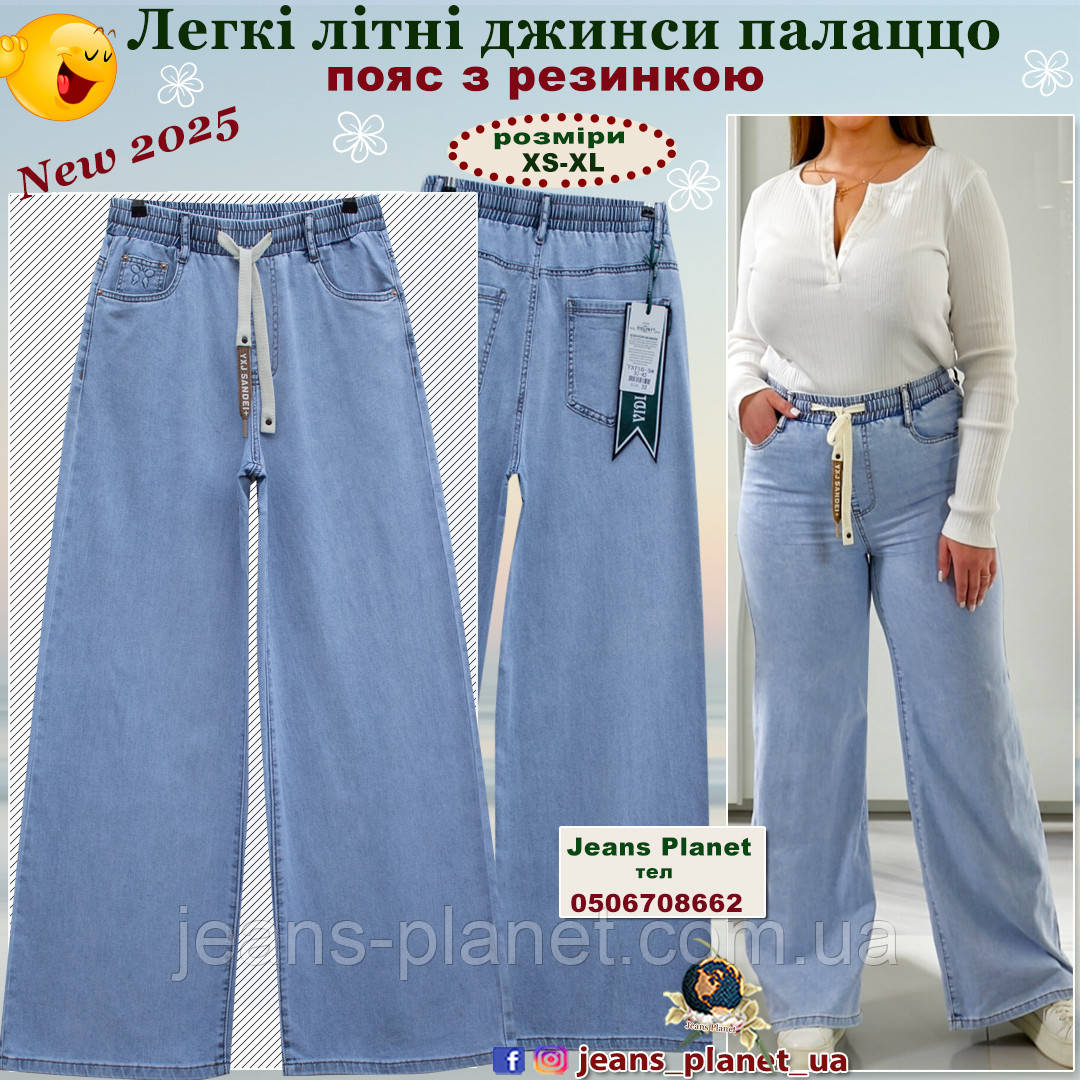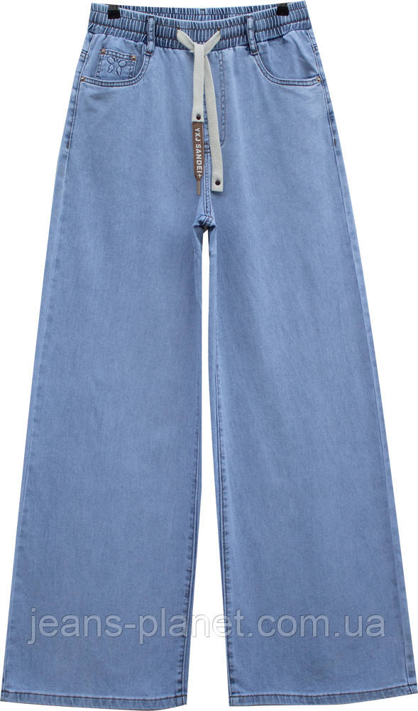 Літні джинси палаццо, висока посадка, пряма, розширена до низу холоша, пояс зібран на зручну широку резинку з протягнутим шнурком.
