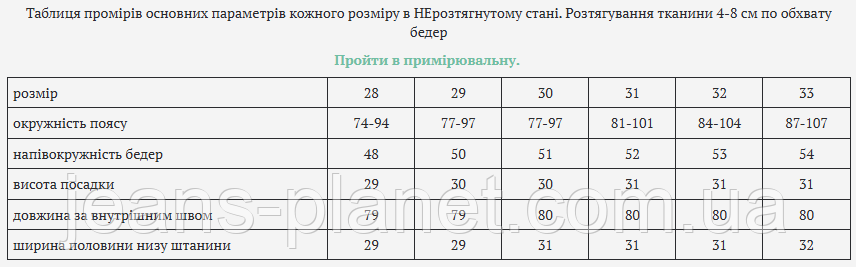 | ширина половини низу штанини | 29 | 29 | 31 | 31 | 31 | 32 |