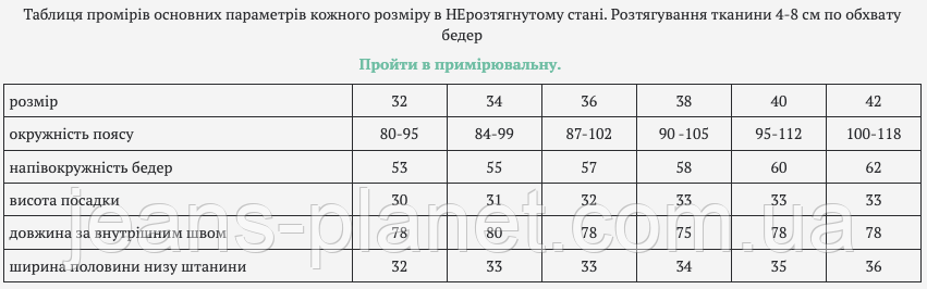Таблиця промірів основних параметрів кожного розміру в НЕрозтягнутому стані. Розтягування тканини 4-8 см по обхвату бедер
