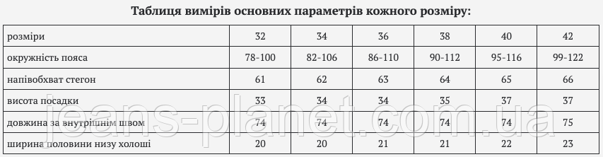 • Докладна інформація про товар і про те, як правильно визначити свій розмір, дивіться на нашому сайті Jeans Planet.