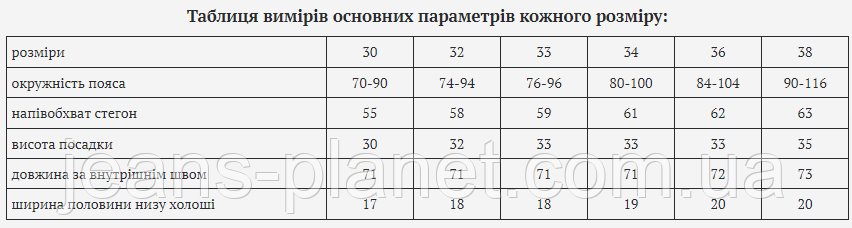 | розміри | 30 | 32 | 33 | 34 | 36 | 38 |