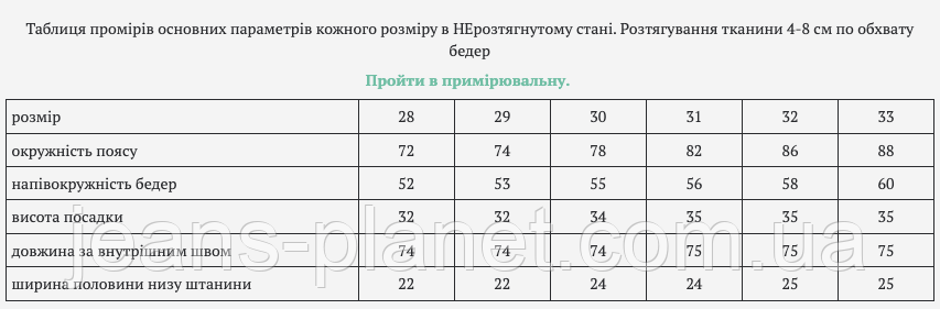 Таблиця промірів основних параметрів кожного розміру в НЕрозтягнутому стані. Розтягування тканини 4-8 см по обхвату бедер