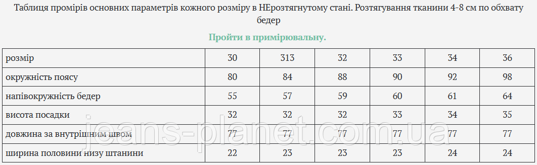 Таблиця промірів основних параметрів кожного розміру в НЕрозтягнутому стані. Розтягування тканини 4-8 см по обхвату бедер