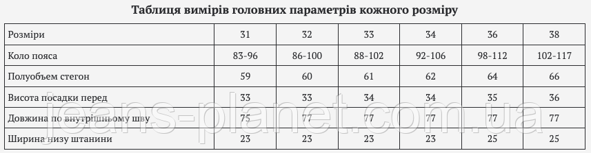 | Ширина низу штанини | 23 | 23 | 23 | 23 | 25 | 25 |