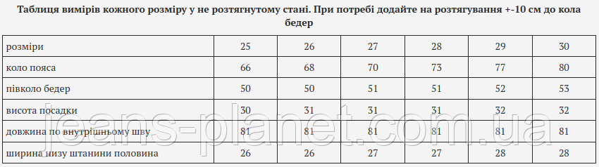 | ширина низу штанини половина | 26 | 26 | 27 | 27 | 28 | 28 |