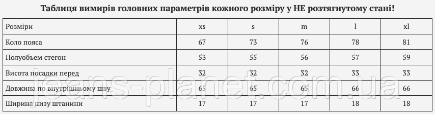 Таблиця вимирів головних параметрів кожного розміру у НЕ розтягнутому стані!