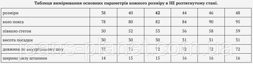 | ширина низу штанини | 14 | 15 | 15 | 16 | 16 | 16 |