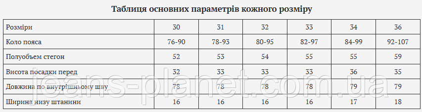 Таблиця основних параметрів кожного розміру