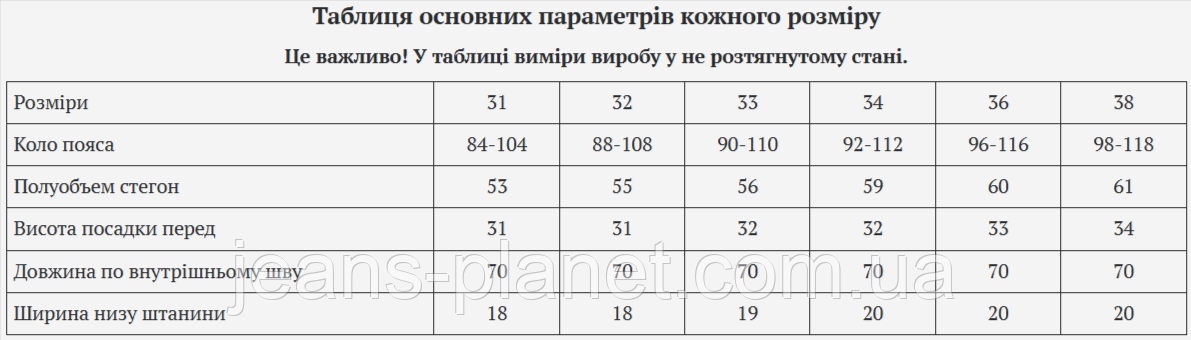 | Ширина низу штанини | 18 | 18 | 19 | 20 | 20 | 20 |