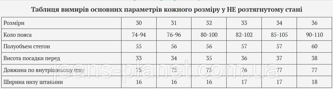 Таблиця вимирів основних параметрів кожного розміру у НЕ розтягнутому стані