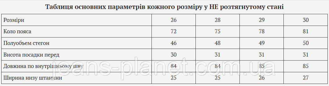 | Ширина низу штанини | 25 | 25 | 26 | 27 |