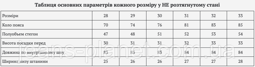 | Ширина низу штанини | 25 | 26 | 26 | 27 | 27 | 28 |