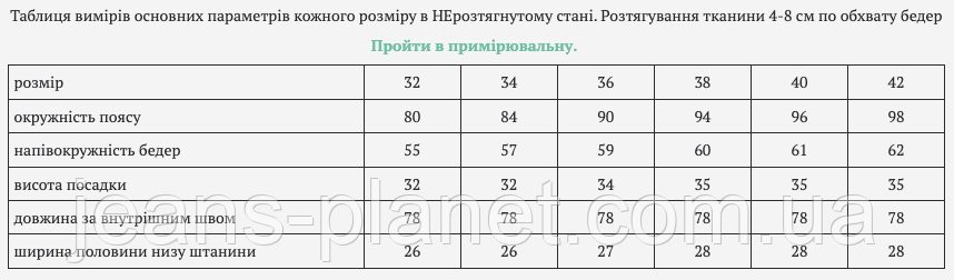 | ширина половини низу штанини | 26 | 26 | 27 | 28 | 28 | 28 |