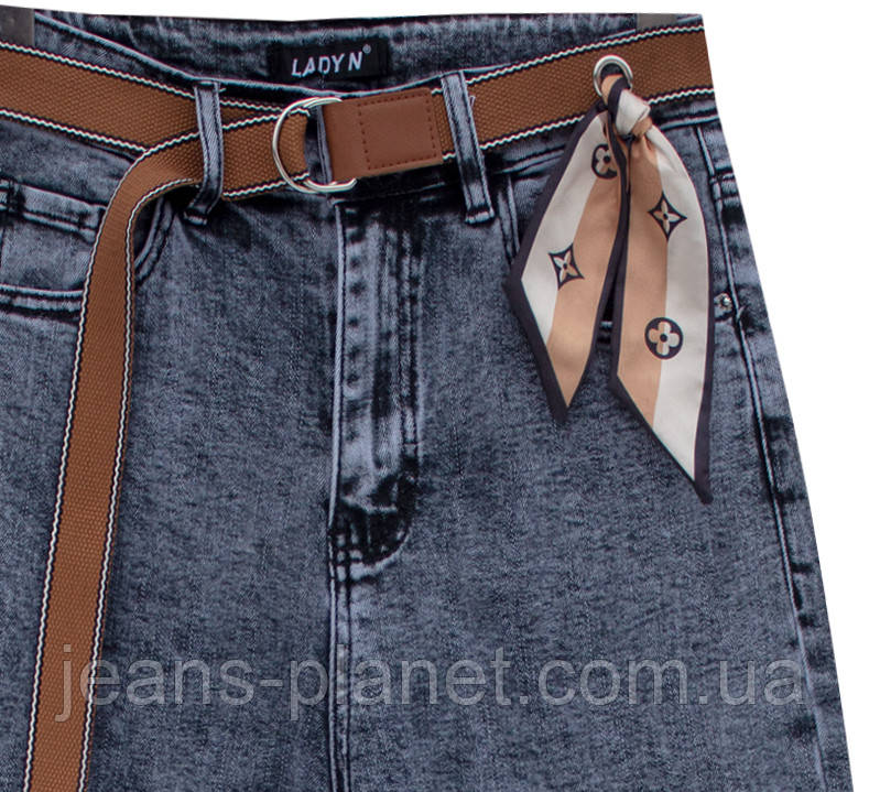 Джинси палаццо, висока посадка, злегка розкльошена донизу штанина. Укомплектовані ошатним дизайнерським поясом-ременем.