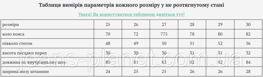 | ширина низу штанини | 24 | 25 | 25 | 26 | 26 | 28 |