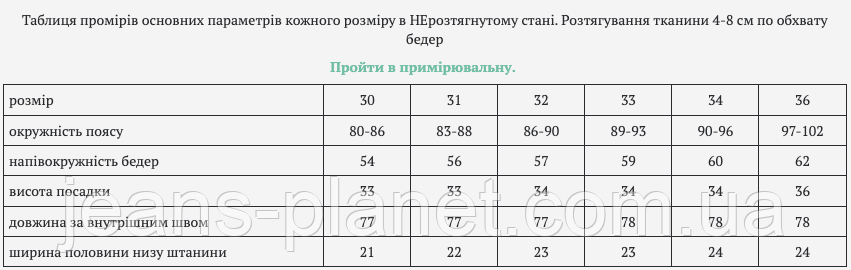 Таблиця промірів основних параметрів кожного розміру в НЕрозтягнутому стані. Розтягування тканини 4-8 см по обхвату бедер