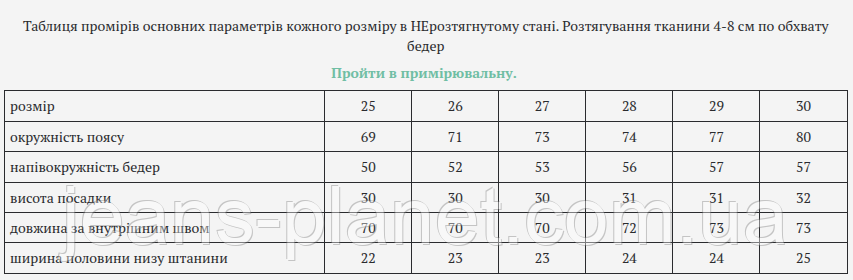 - Якщо Ви робите замовлення в каталозі Prom.ua, перевірте правильність обраного розміру, для цього скопіюйте посилання під цим текстом і вставте його в пошук браузера. Посилання — веде на цю позицію на нашому сайті. Після переходу на сайт натисніть на виділений текст Пройти в примірювальну. , ознайомтеся з нашими рекомендаціями та обирайте розмір за таблицею