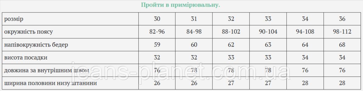 | розмір | 30 | 31 | 32 | 33 | 34 | 36 |