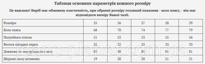 | Ширина низу штанини | 19 | 20 | 20 | 21 | 21 |