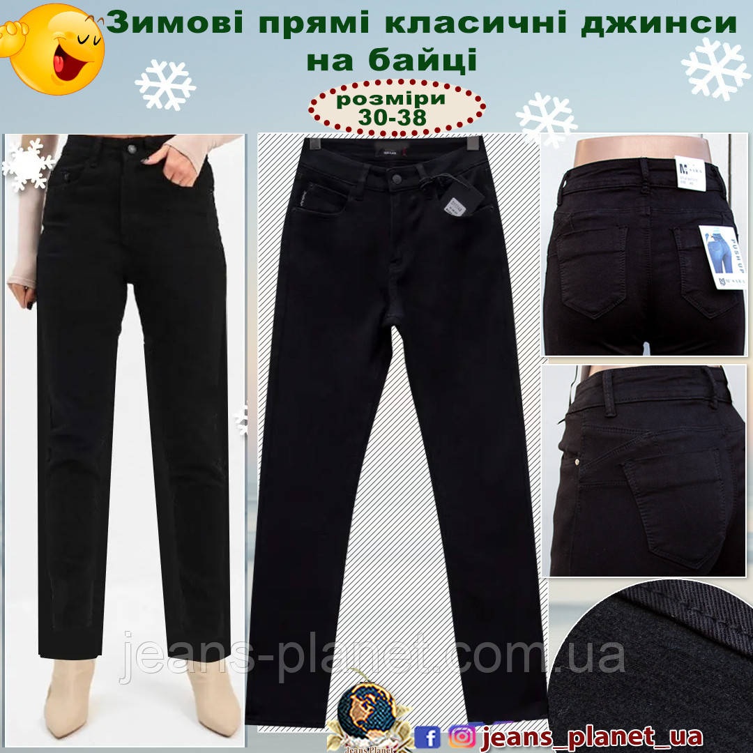 - Стильні жіночі утеплені джинси прямого крою чорного кольору на тонкому утеплювачі — євробайка