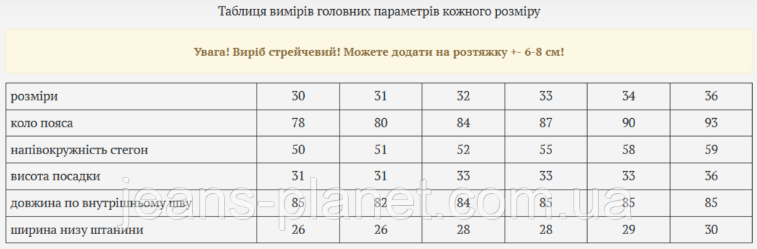 | ширина низу штанини | 26 | 29 | 30 |