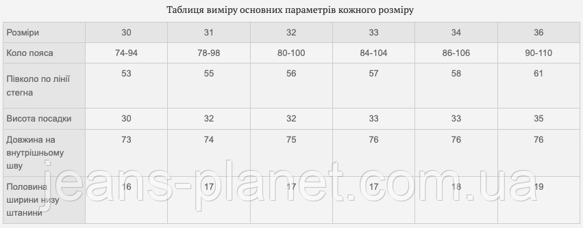 Таблиця виміру основних параметрів кожного розміру