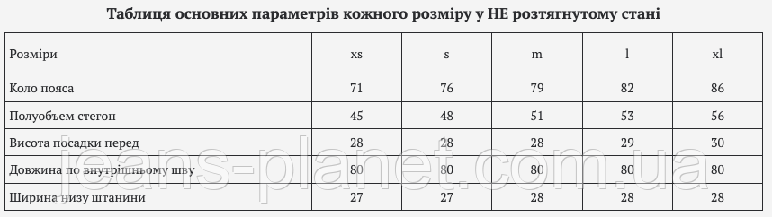 | Ширина низу штанини | 27 | 27 | 28 | 28 | 28 |