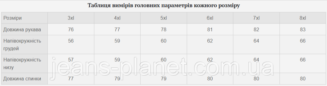 Таблиця вимірів головних параметрів кожного розміру