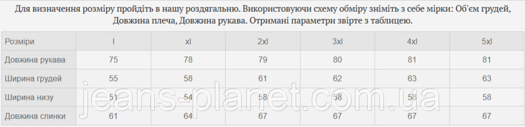 Для визначення розміру пройдіть в нашу роздягальню. Використовуючи схему обміру зніміть з себе мірки: Об'єм грудей, Довжина плеча, Довжина рукава. Отримані параметри звірте з таблицею.