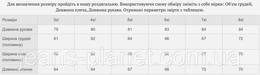 Для визначення розміру пройдіть в нашу роздягальню. Використовуючи схему обміру зніміть з себе мірки: Об'єм грудей, Довжина плеча, Довжина рукава. Отримані параметри звірте з таблицею.