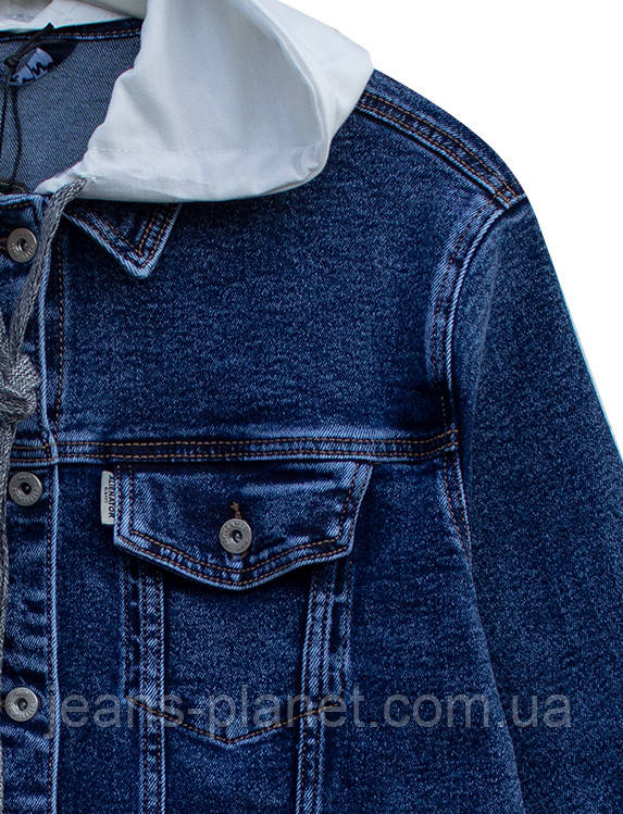 - Новинка! Модна жіноча джинсова куртка синього кольору з відстібним трикотажним капюшоном білого кольору.