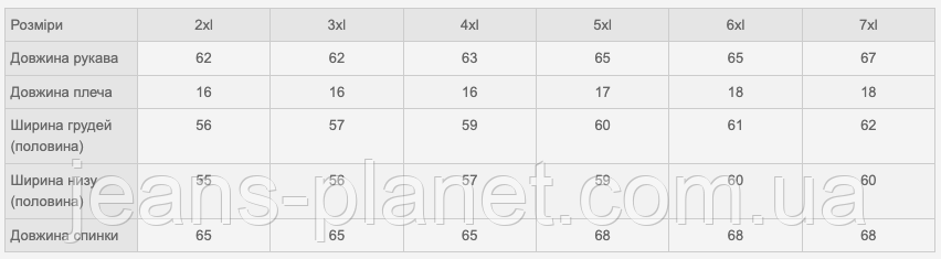 | Довжина рукава | 62 | 62 | 63 | 65 | 65 | 67 |