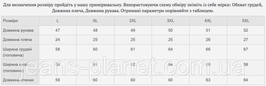 Для визначення розміру пройдіть у нашу примірювальну. Використовуючи схему обміру зніміть із себе мірки: Обхват грудей, Довжина плеча, Довжина рукава. Отримані параметри порівняйте з таблицею.
