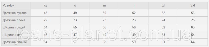 | Довжина рукава | 48 | 49 | 50 | 52 | 52 | 53 |