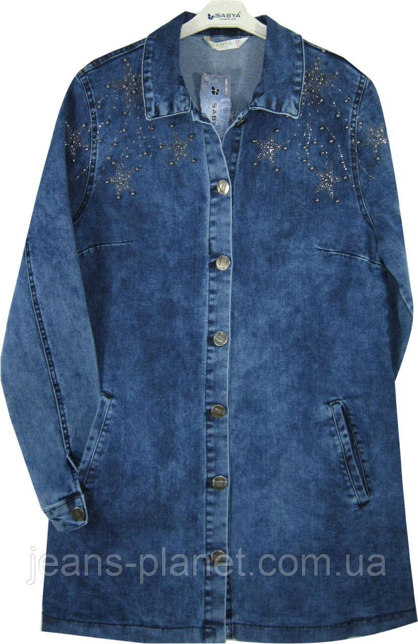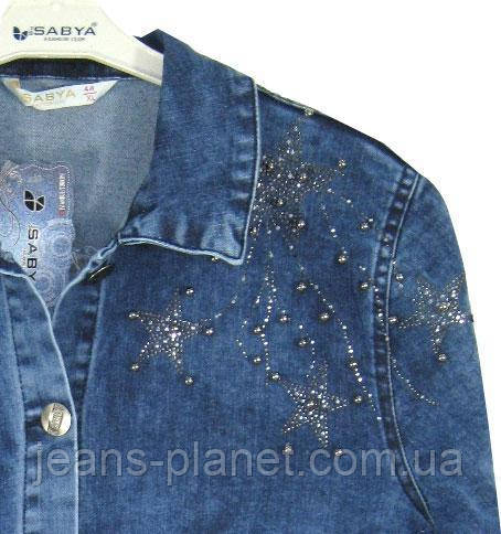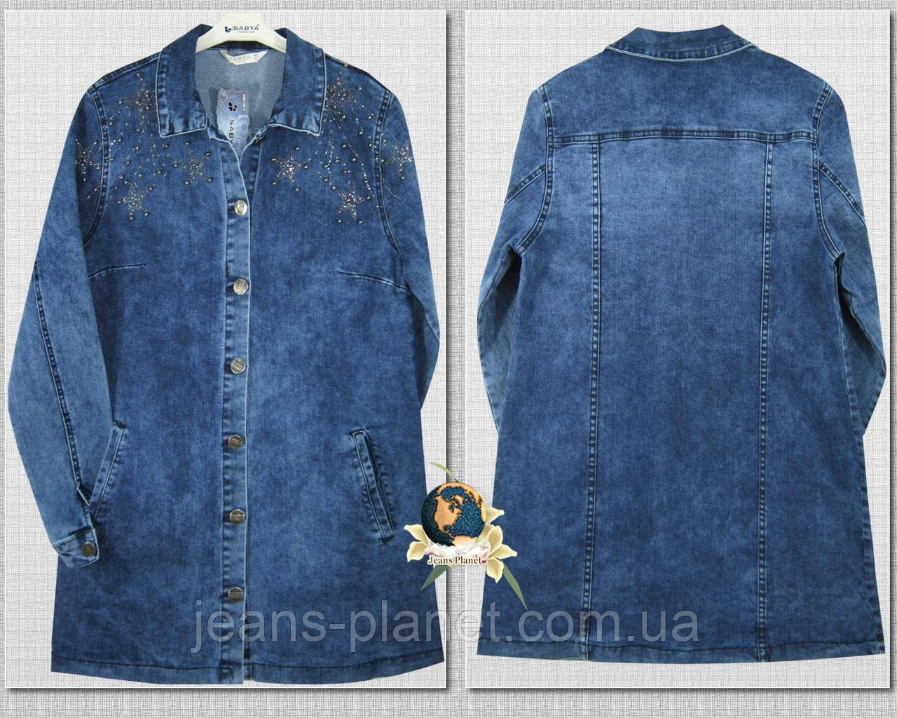 Модний жіночий джинсовий кардиган синього кольору з прикрасою у формі зірочок із каменів і стразів у розмірах батал.