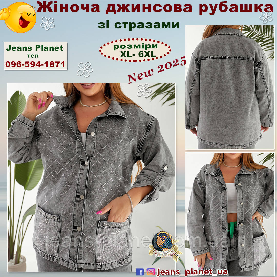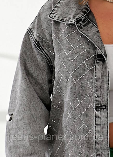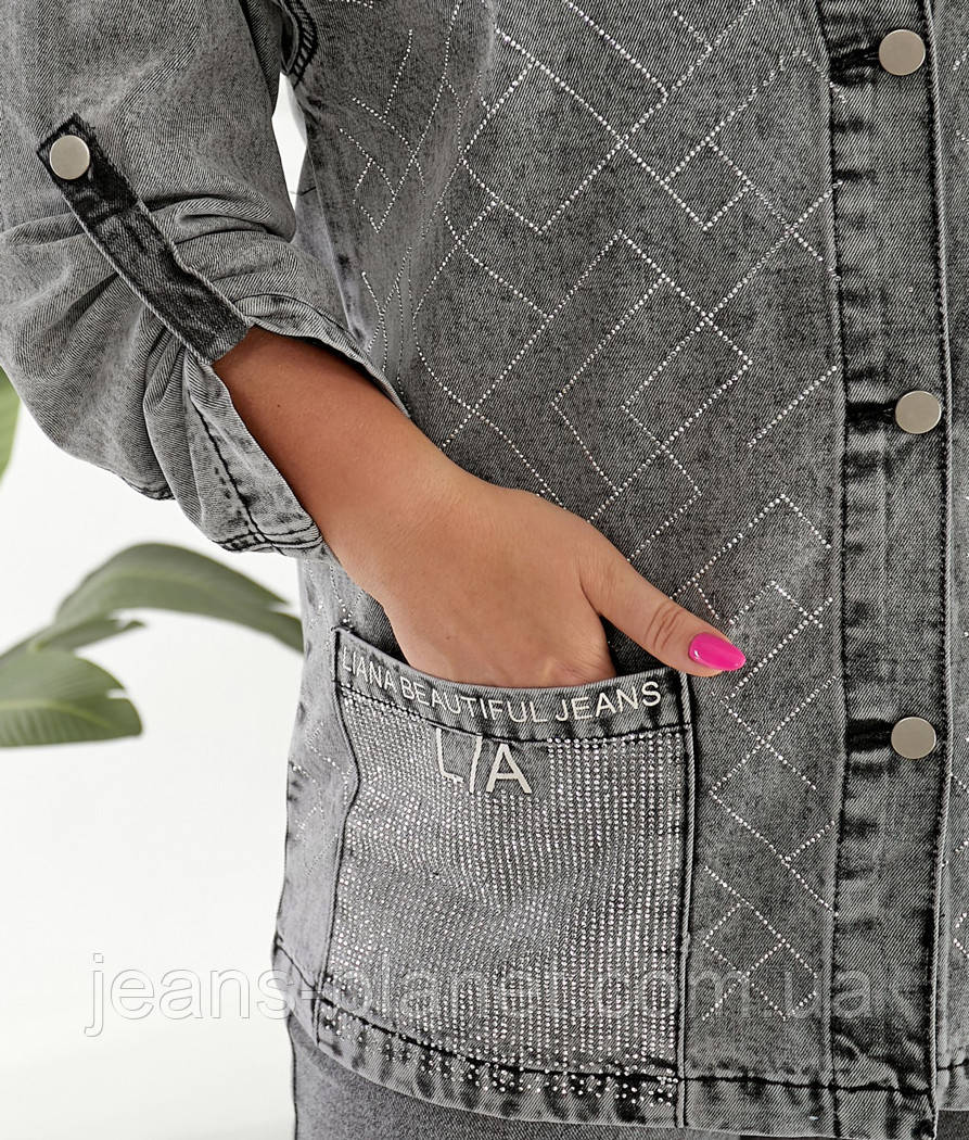 Ошатна жіноча джинсова сорочка сірого кольору зі стразами