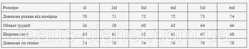 | Довжина рукава від комірца | 70 | 71 | 72 | 72 | 73 | 74 |