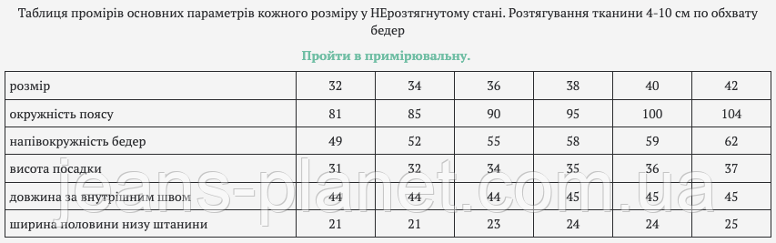 Таблиця промірів основних параметрів кожного розміру у НЕрозтягнутому стані. Розтягування тканини 4-10 см по обхвату бедер